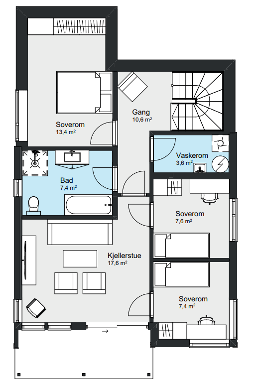 Går du inn hovedinngangen i andre etasje finner du soverom, bad og en åpen stue- og kjøkkenløsning med tilgang til en koselig altan. Går du ned i første etasje finner du resten av fasilitetene du trenger for at Giske skal være en komplett bolig for hele familien.