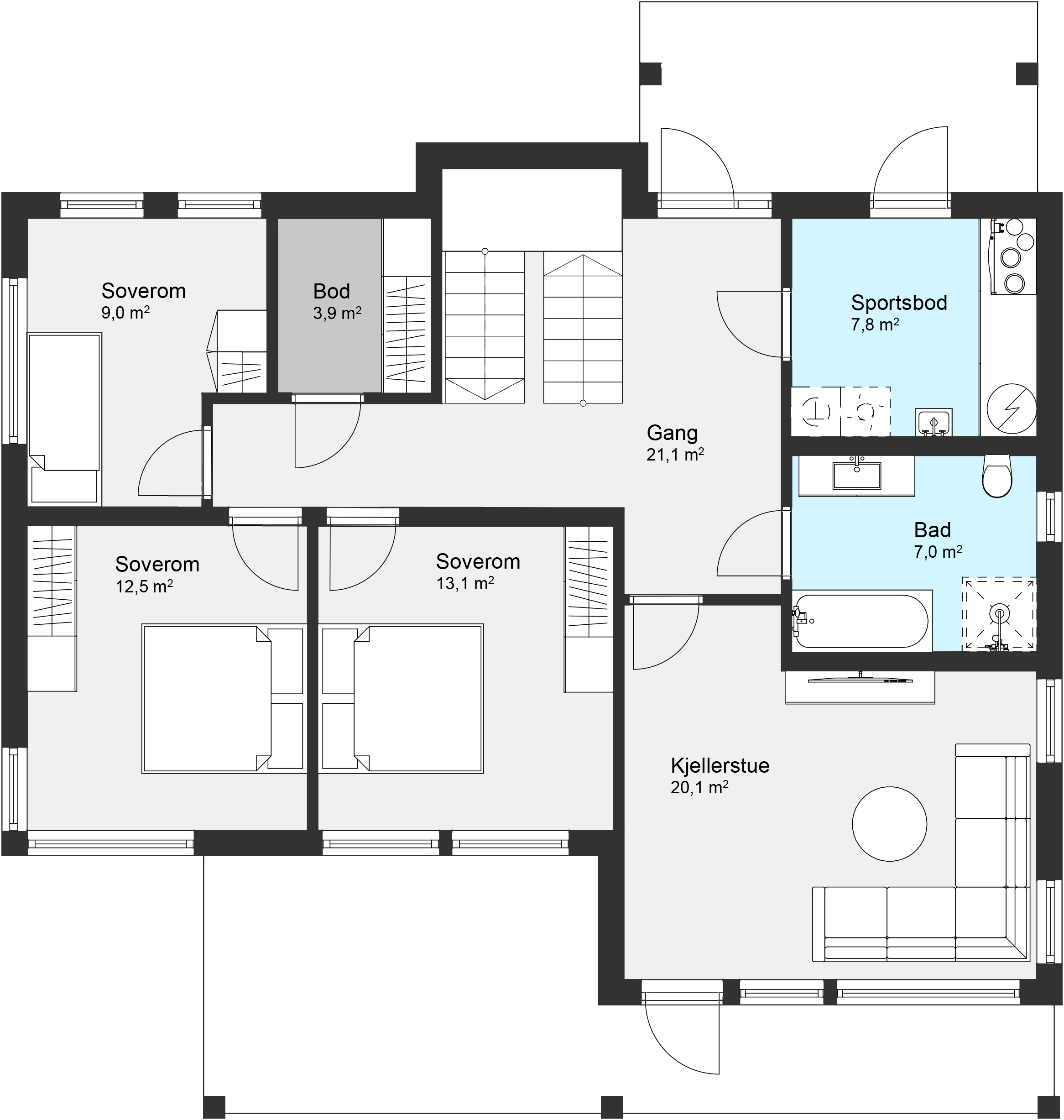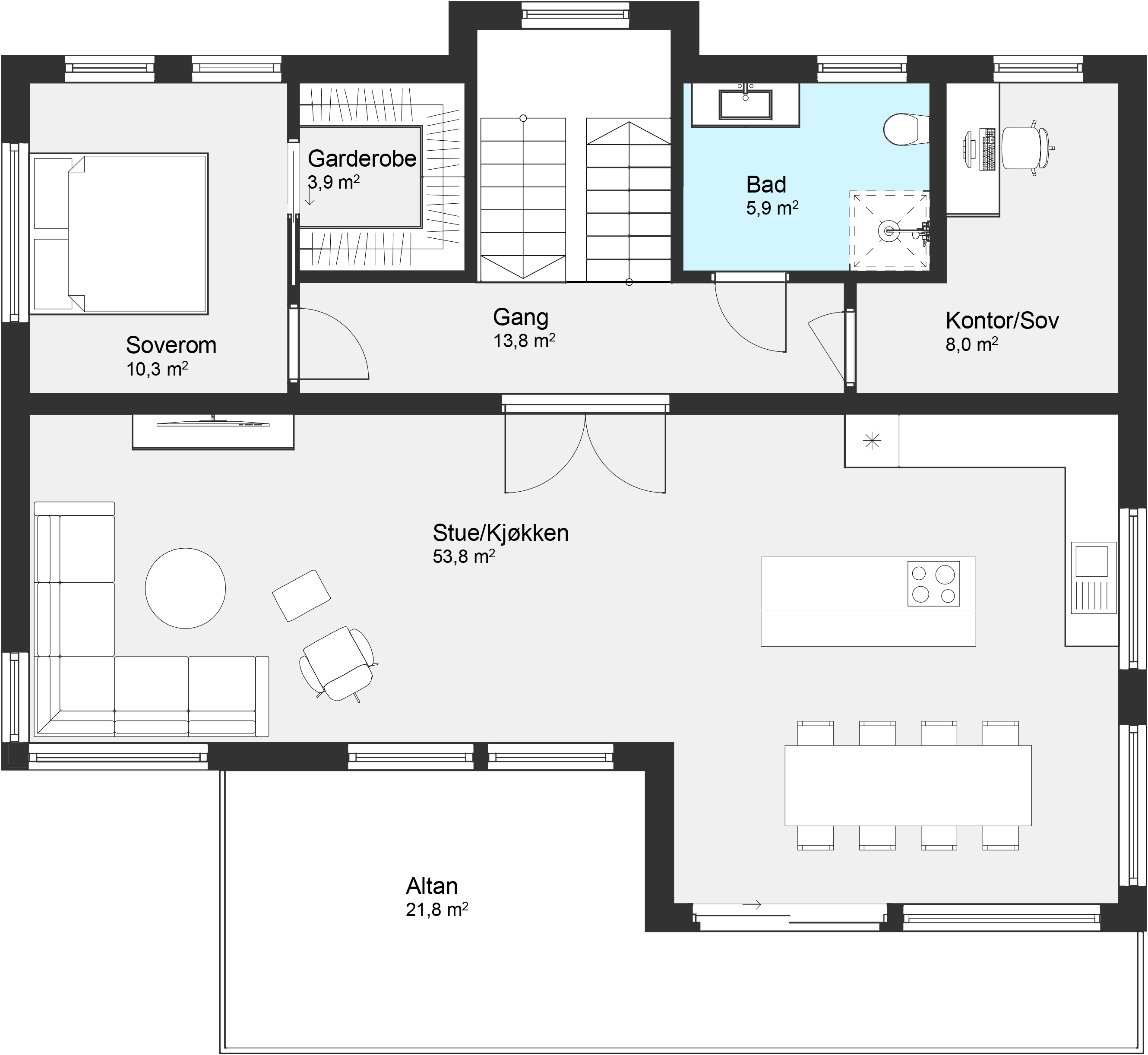 Boligen har fem soverom, tre i første etasje og to i andre – hvorav hovedsoverommet har både walk-in garderobe og bad. Stue- og kjøkkenløsningen i andre etasje har direkte utgang til altan og gir et åpent oppholdsrom med mye lys og utsikt.