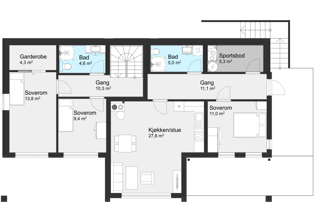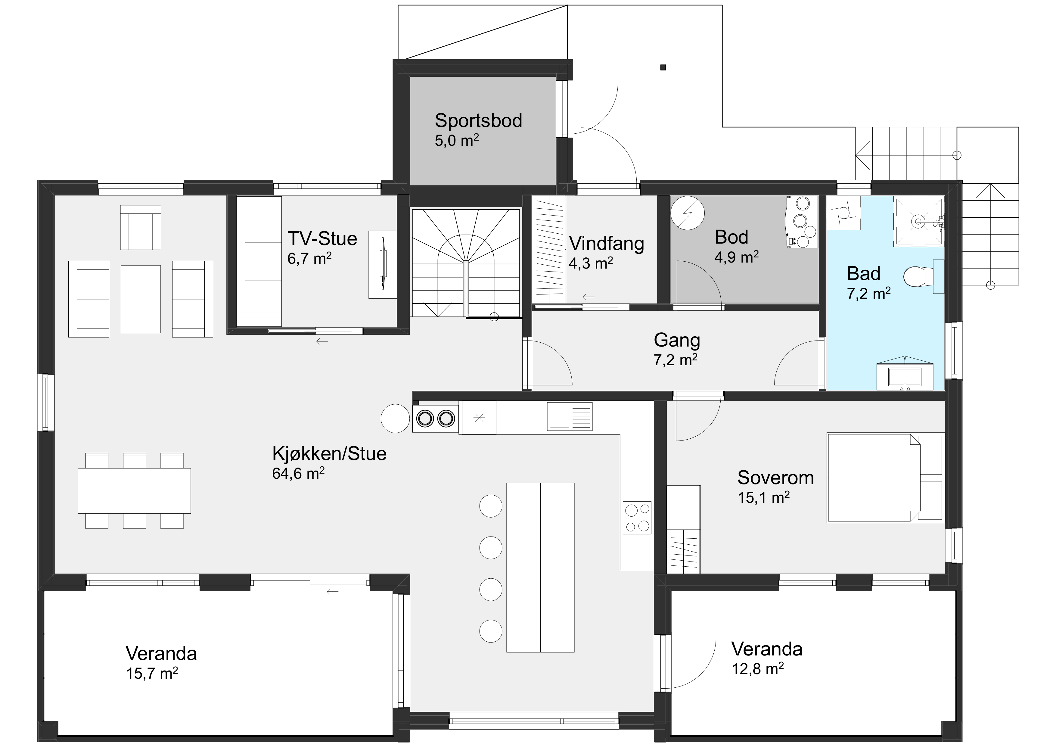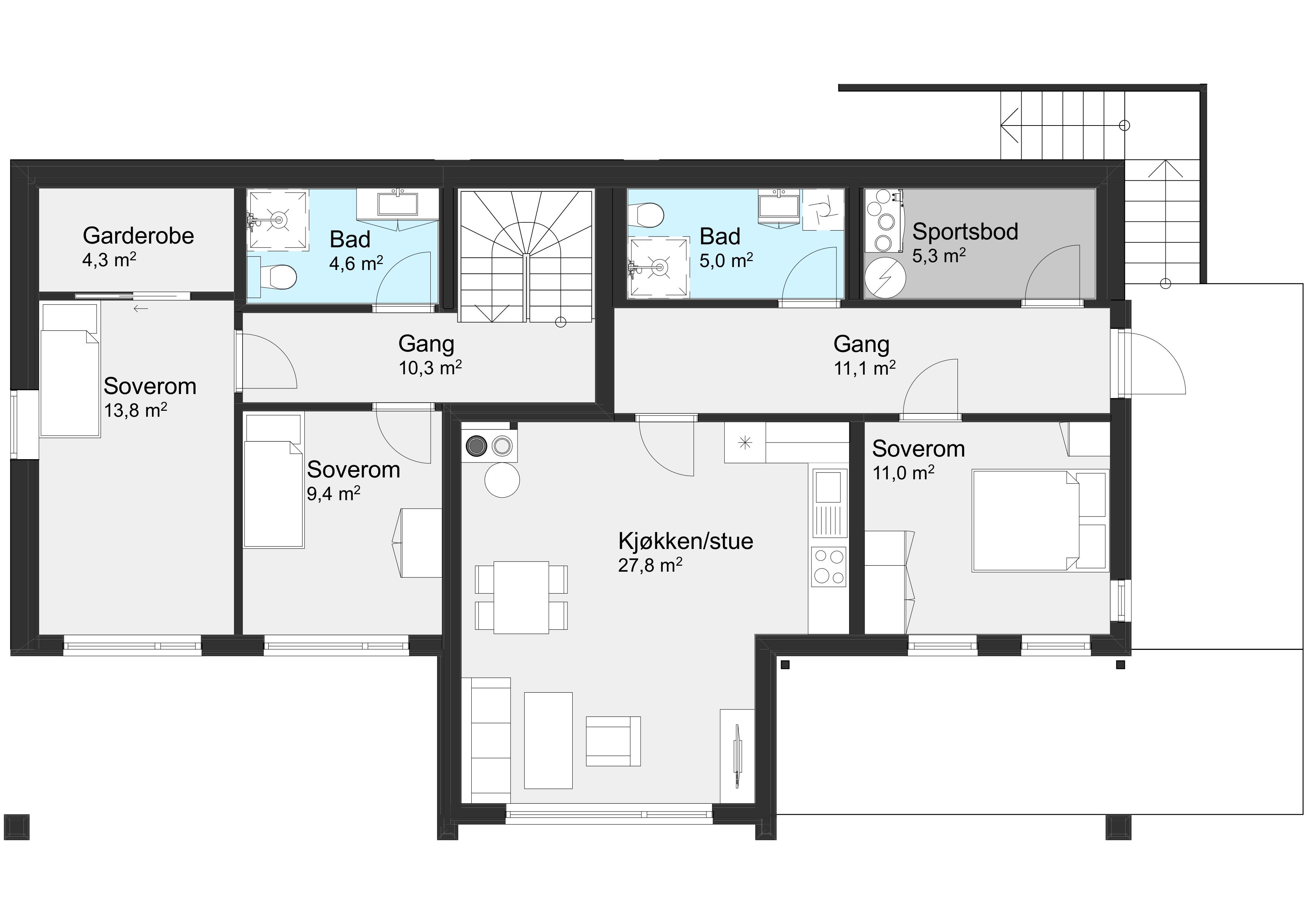 Sotra er en moderne bolig som kombinerer stil og funksjonalitet. Perfekt for skrå tomter, tilbyr den en fullverdig utleiedel med stue/kjøkken, soverom, bad og sportsbod – ideelt for ekstra inntekt eller til ungdom i etableringsfasen.