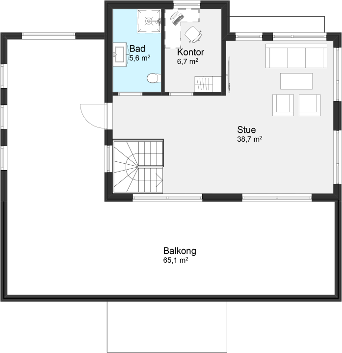 Hovedplanet har en romslig stue- og kjøkkenløsning med direkte utgang til uteområdet. Høydepunktet er likevel takterrassen på 65 m² – perfekt for alt fra morgenkaffe til selskap på sommerkvelden.