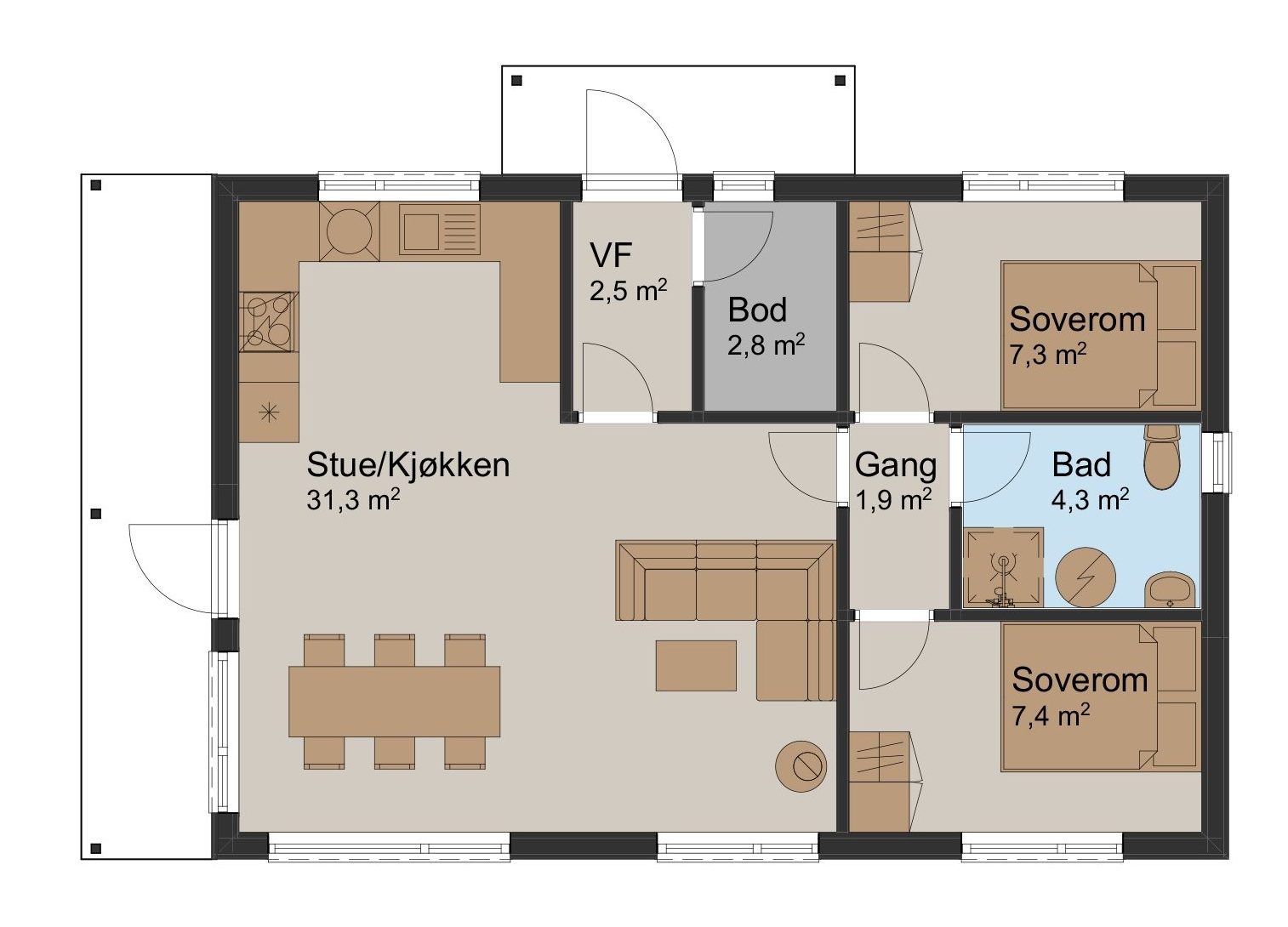 Du kommer inn i hytten gjennom et overbygd inngangsparti som skjermer for vær og vind. Vindfanget leder deg videre til en praktisk bod og til allrommet, en innholdsrik stue-/kjøkkenløsning hvor skråtak gir følelsen av et luftig rom med god plass. Her har du en egen kjøkkenkrok, en spise-sone og nok rom til en sittegruppe med sofa og gode lenestoler foran peisen. Vi har plassert vinduer og verandadører i glass i stue-/kjøkkenavdelingen for at du kan nyte utsikten og naturen utenfor gjennom alle årets sesonger. Den overbygde uteplassen gir deg muligheten for fine stunder ute i frisk luft. Fra allrommet kan du gå videre til en gang som leder deg til hyttens to soverom og et praktisk baderom.